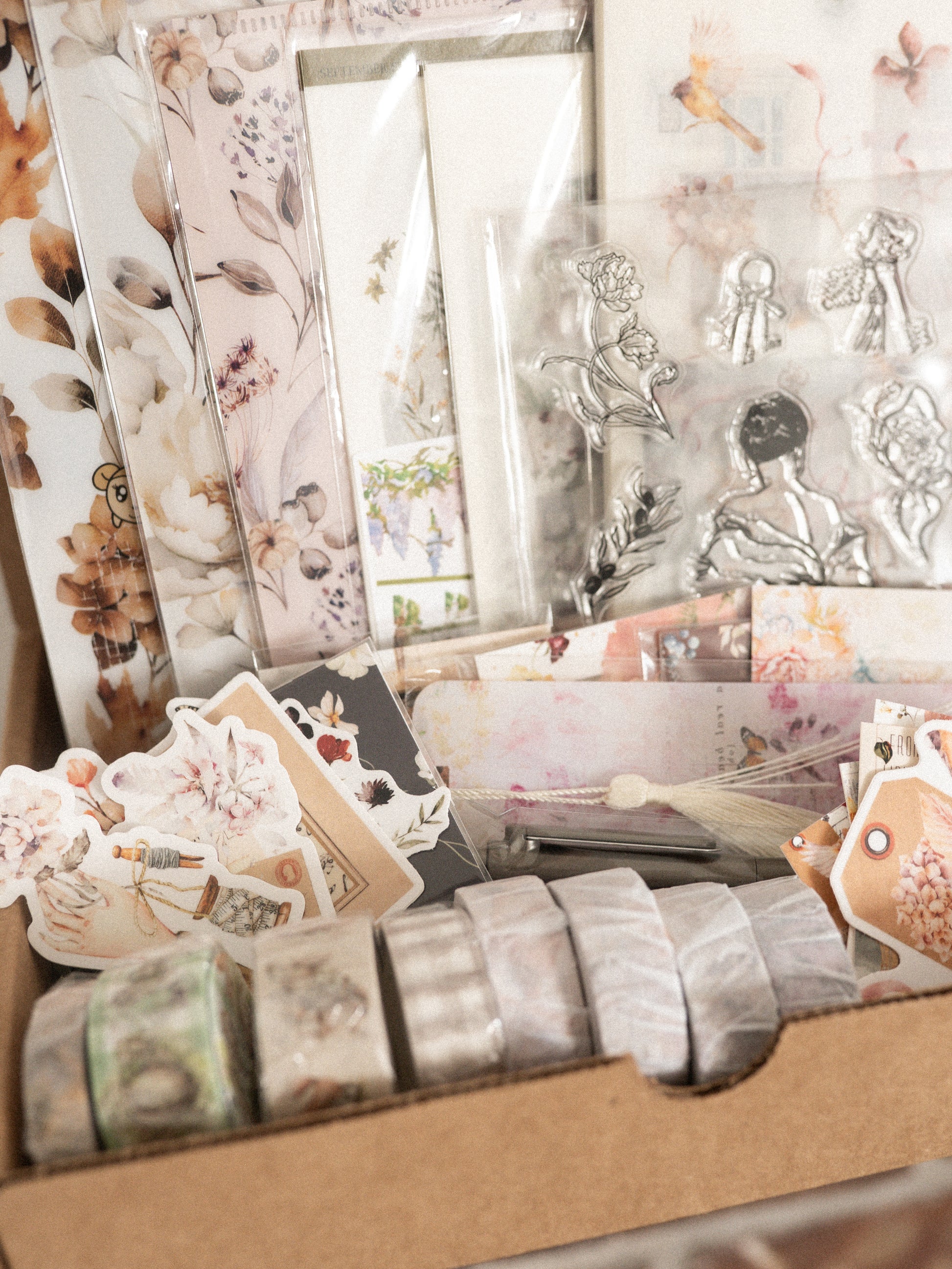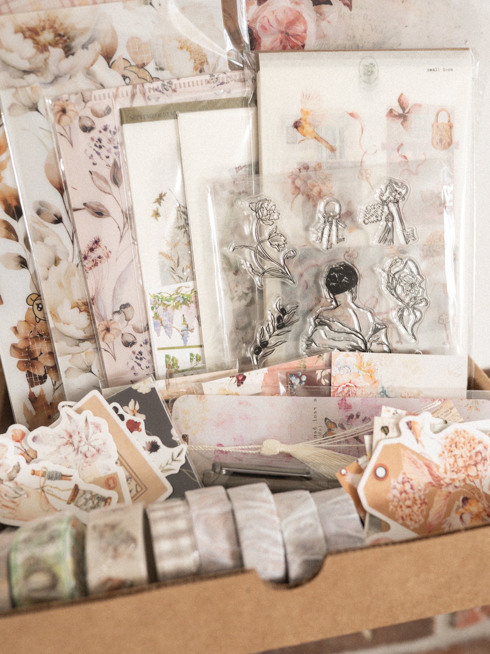 A box filled with 35+ washi stickers, vinyl die cuts, a sticker release book, file folders, a bookmark, an acrylic stamp, 2 pins and more. Stickers are mostly from past stationery subscriptions and past collections. They are not oops, so they are 100% usable stickers.