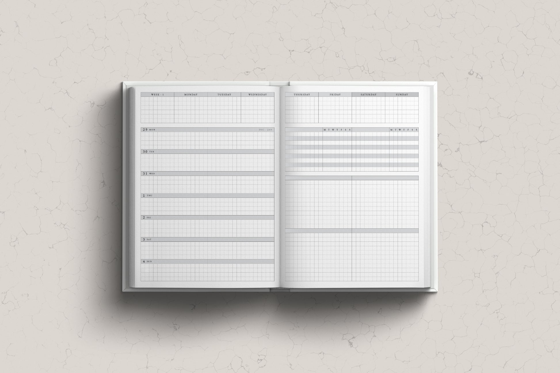 - Monthly Overview Page: Keep your planner beautiful and yet functional. We designed a minimal layout for the monthly section where you have the freedom to organize in a way that makes sense to you.